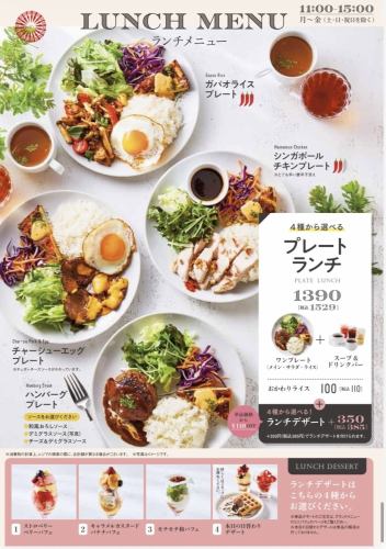 プレートの種類は7種類ご用意しております!メイン・サラダ・ライスのワンプレートとスープ&ドリンクバーもついてボリューム満点◎ライスのおかわりも自由なので満足すること間違いなし!+385円(税込)で本日の特製デザートをご用意しております。詳しくはスタッフにお尋ねください♪